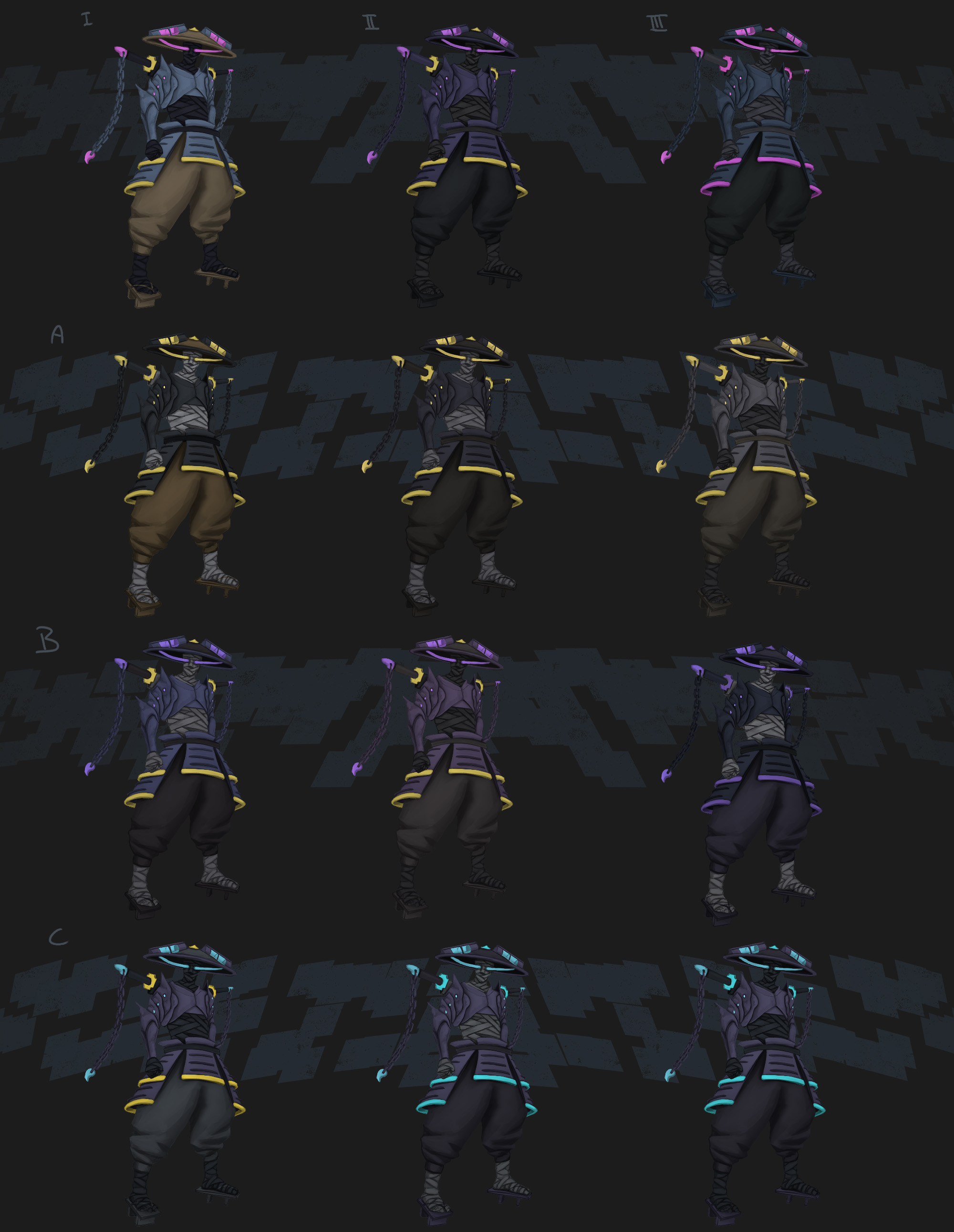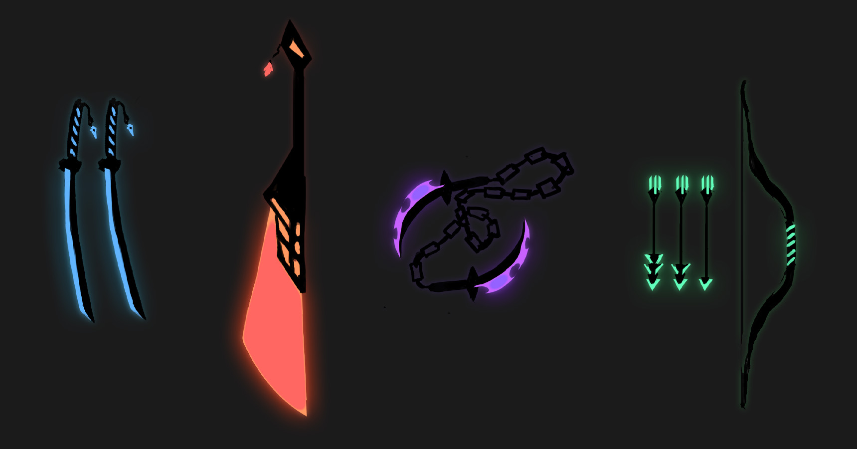 In the final game, you will be able to choose from four different characters, each with their own unique weapons and abilities. Below are the concepts for the weapons.
