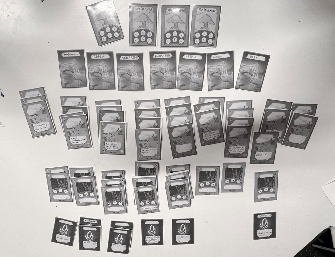 I started the project, writing abilities on printed blanco versions of the cards. Trying to keep the balancing fair. After a lot of playtesting and adjusting, I made a version in colors. Finally, I polished everything, and after a last balancing, I printed the final version of the game.