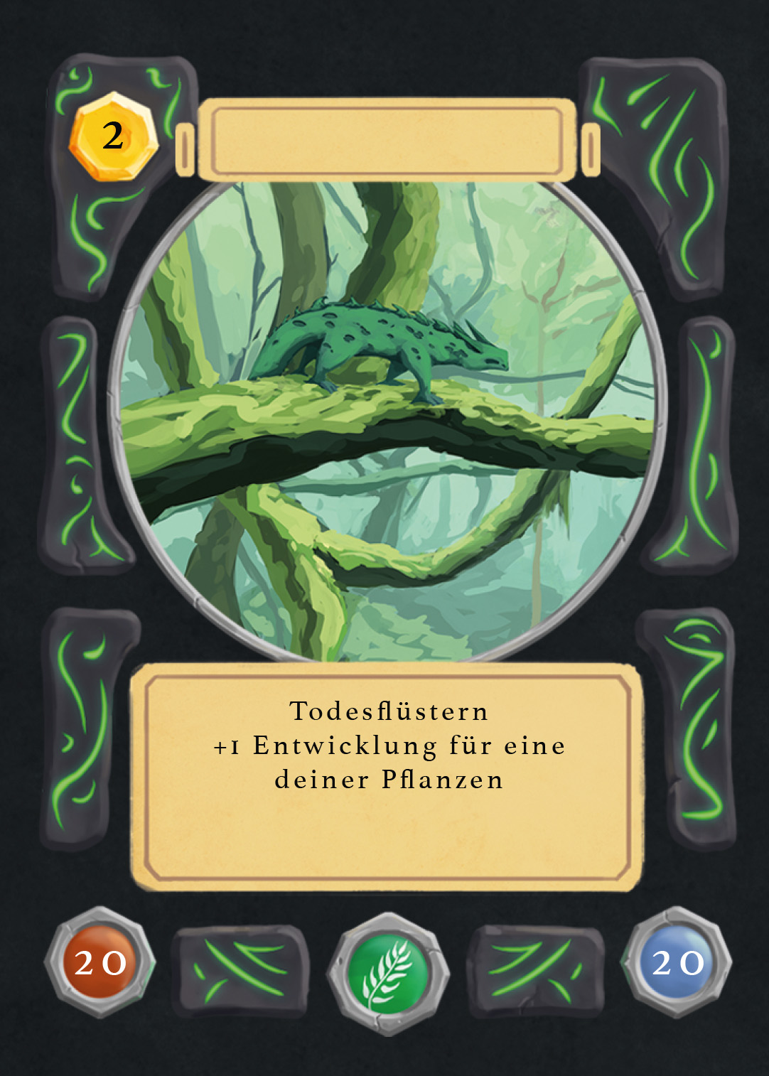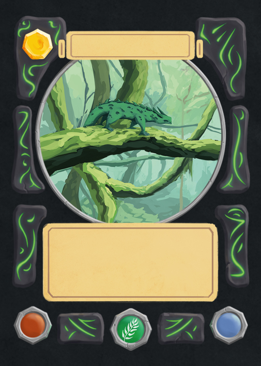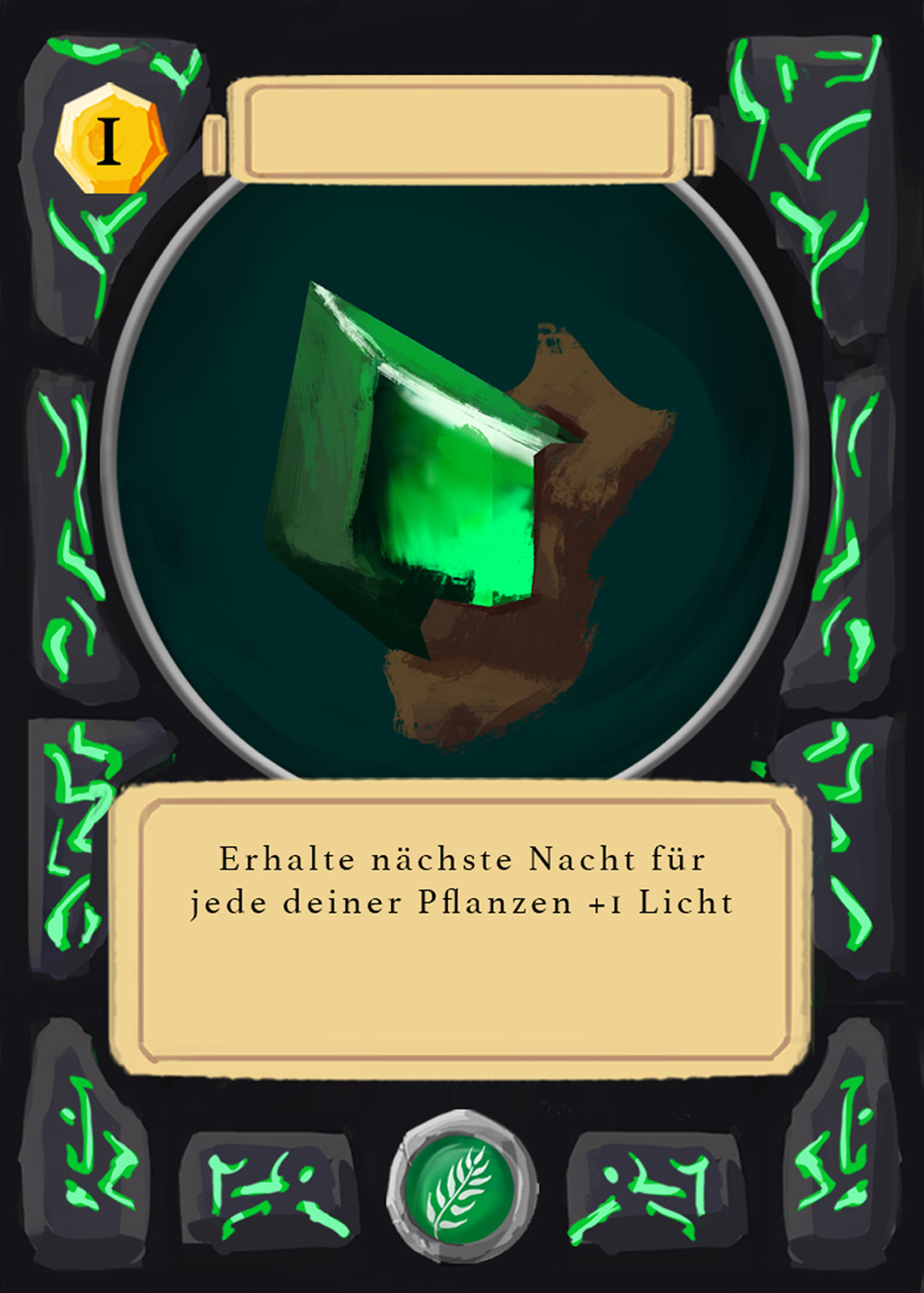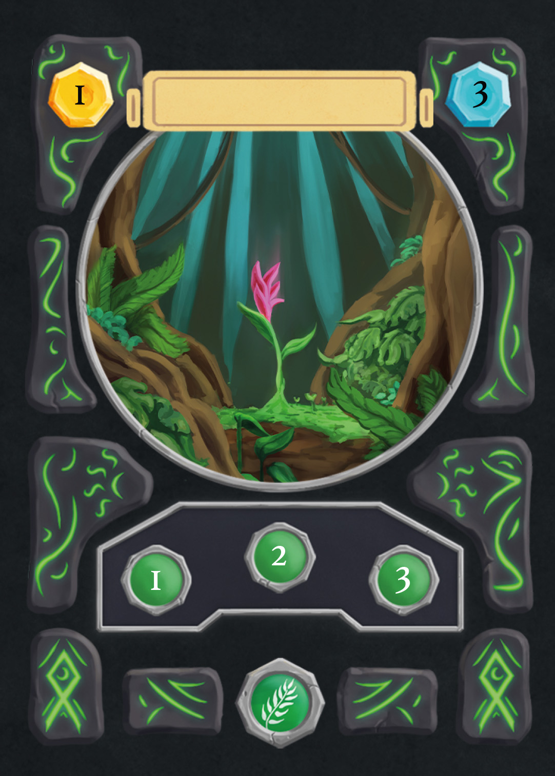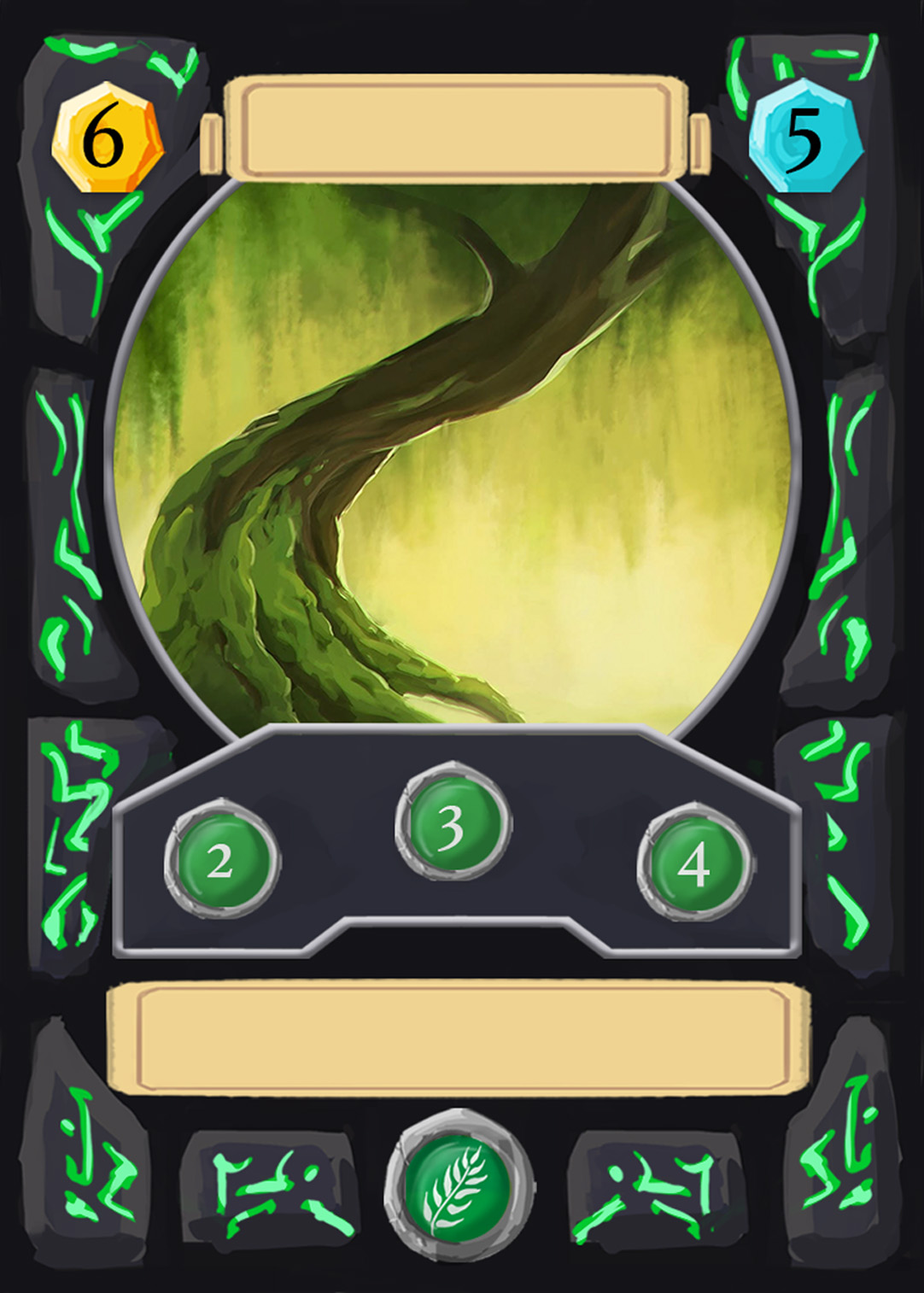 There are spell-, creature-, plant-, and adventure cards in Nagi, and to separate the plants from the rest, I changed the backprint color from orange to green. Here you can see the evolution of the card UI design from the first ideas to the final version.