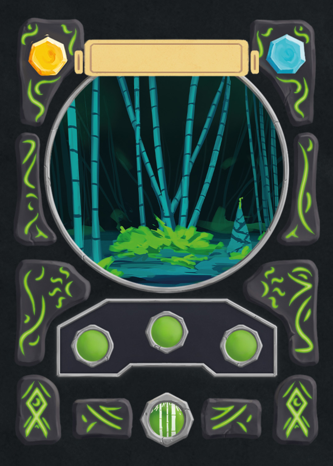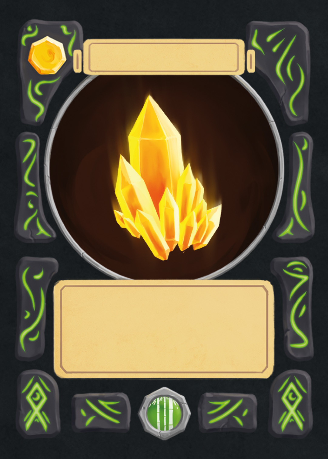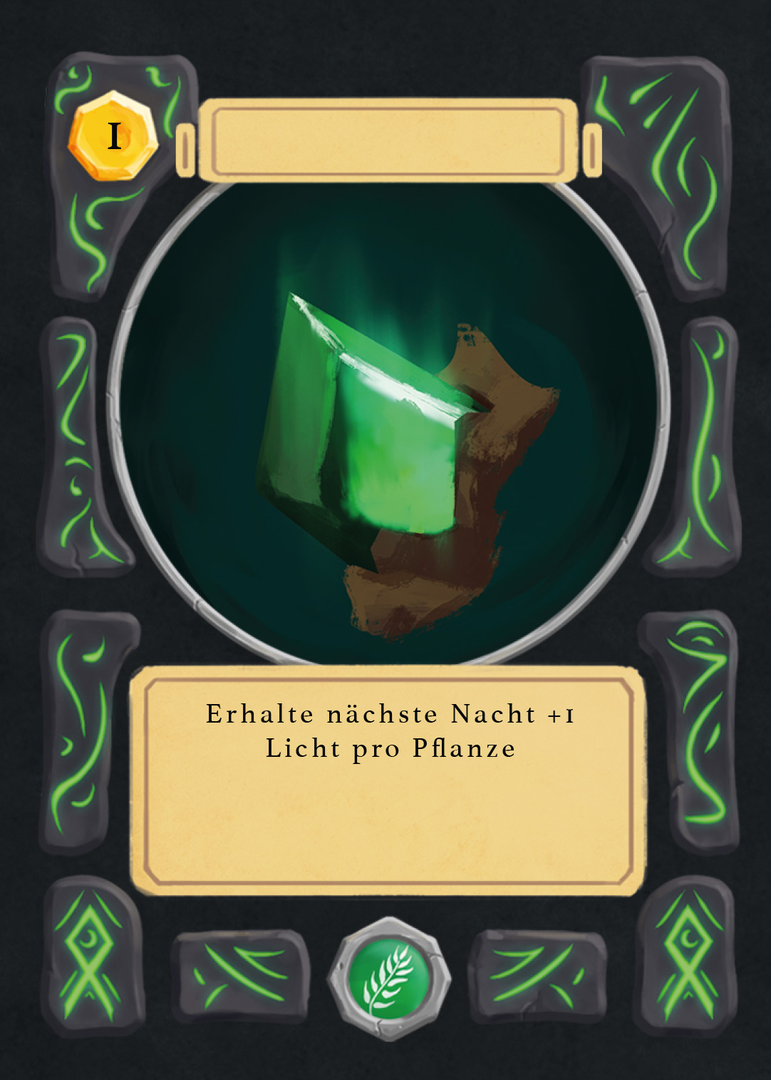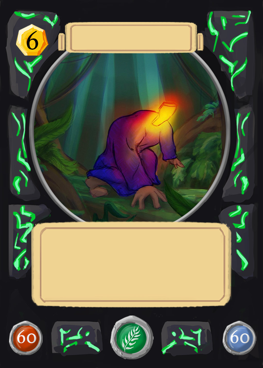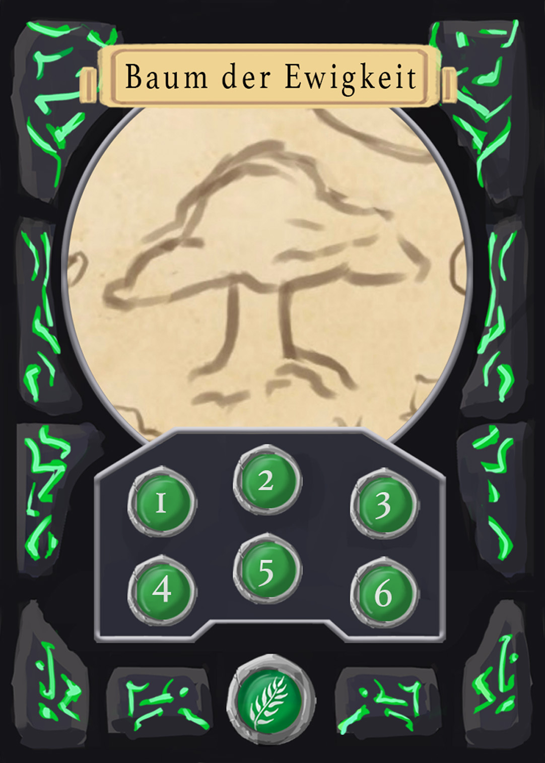 There are spell-, creature-, plant-, and adventure cards in Nagi, and to separate the plants from the rest, I changed the backprint color from orange to green. Here you can see the evolution of the card UI design from the first ideas to the final version.