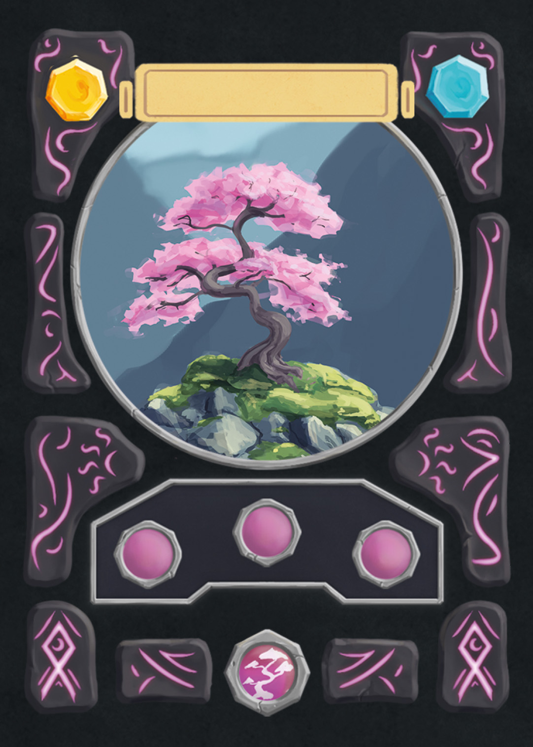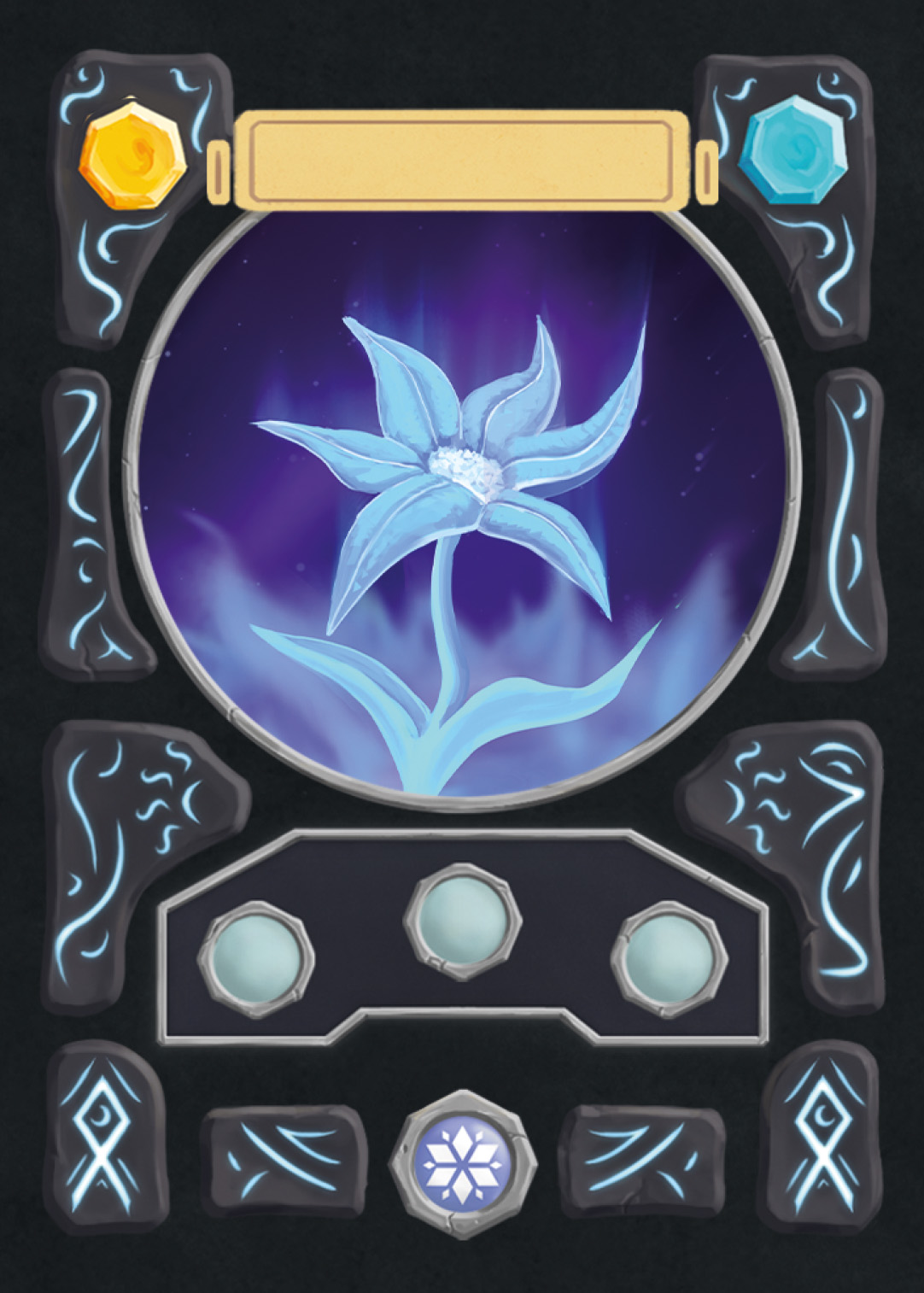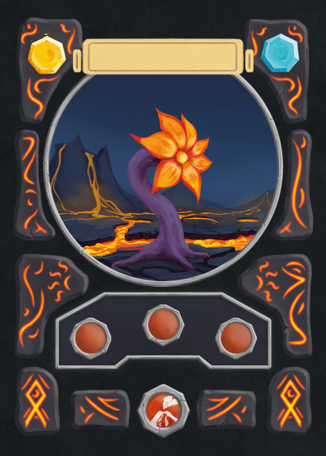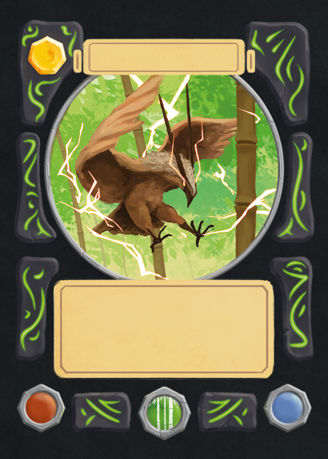 There are spell-, creature-, plant-, and adventure cards in Nagi, and to separate the plants from the rest, I changed the backprint color from orange to green. Here you can see the evolution of the card UI design from the first ideas to the final version.