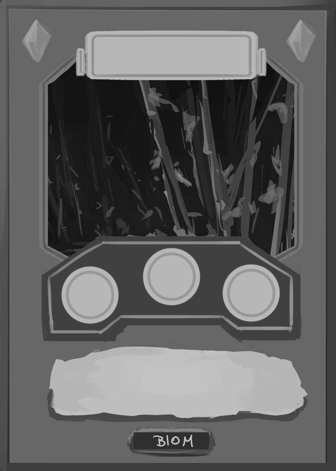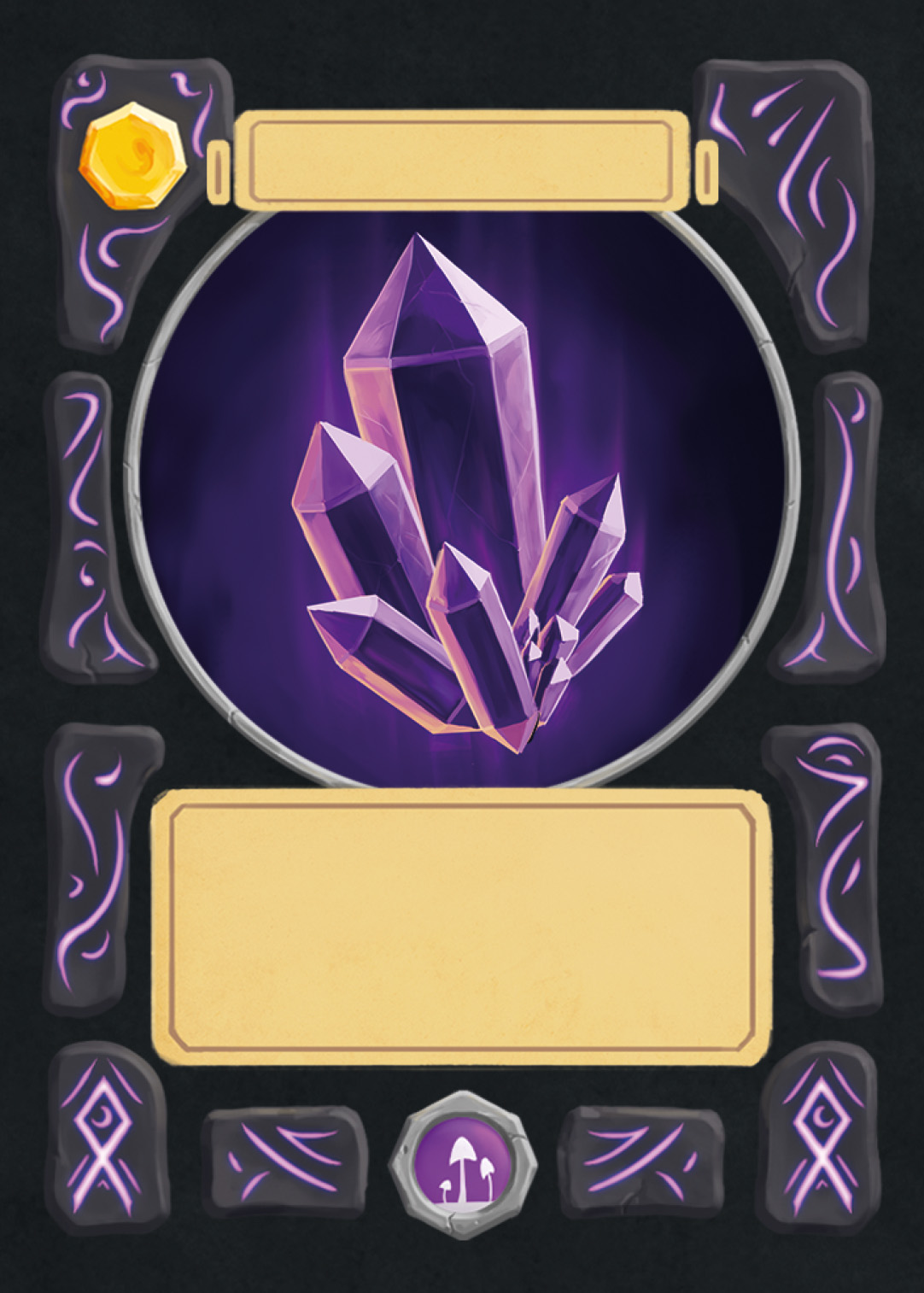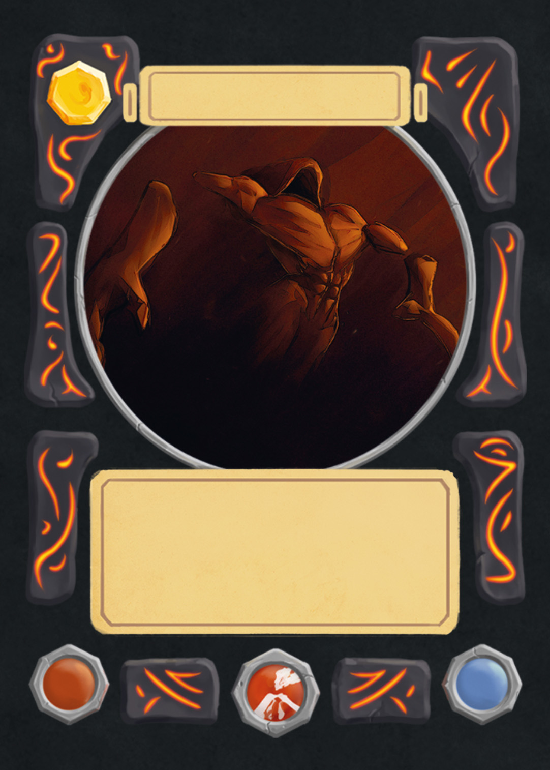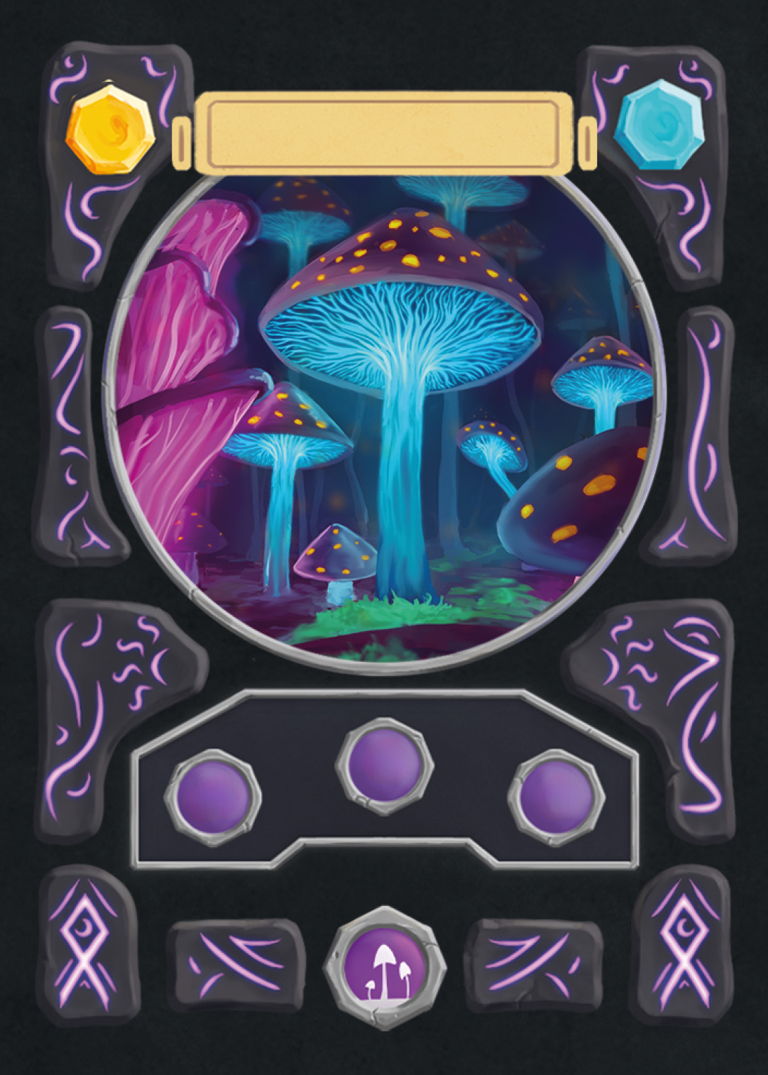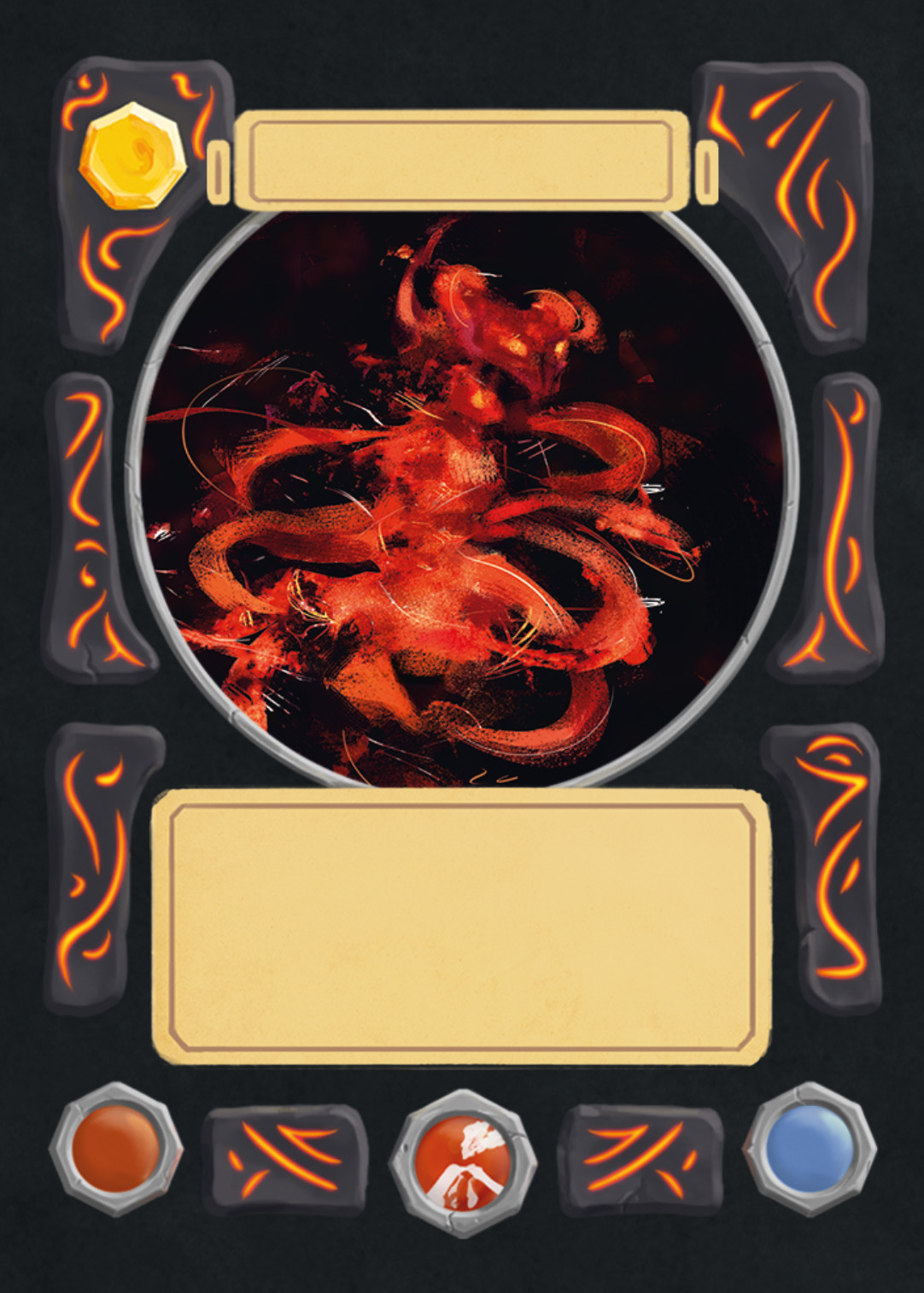There are spell-, creature-, plant-, and adventure cards in Nagi, and to separate the plants from the rest, I changed the backprint color from orange to green. Here you can see the evolution of the card UI design from the first ideas to the final version.